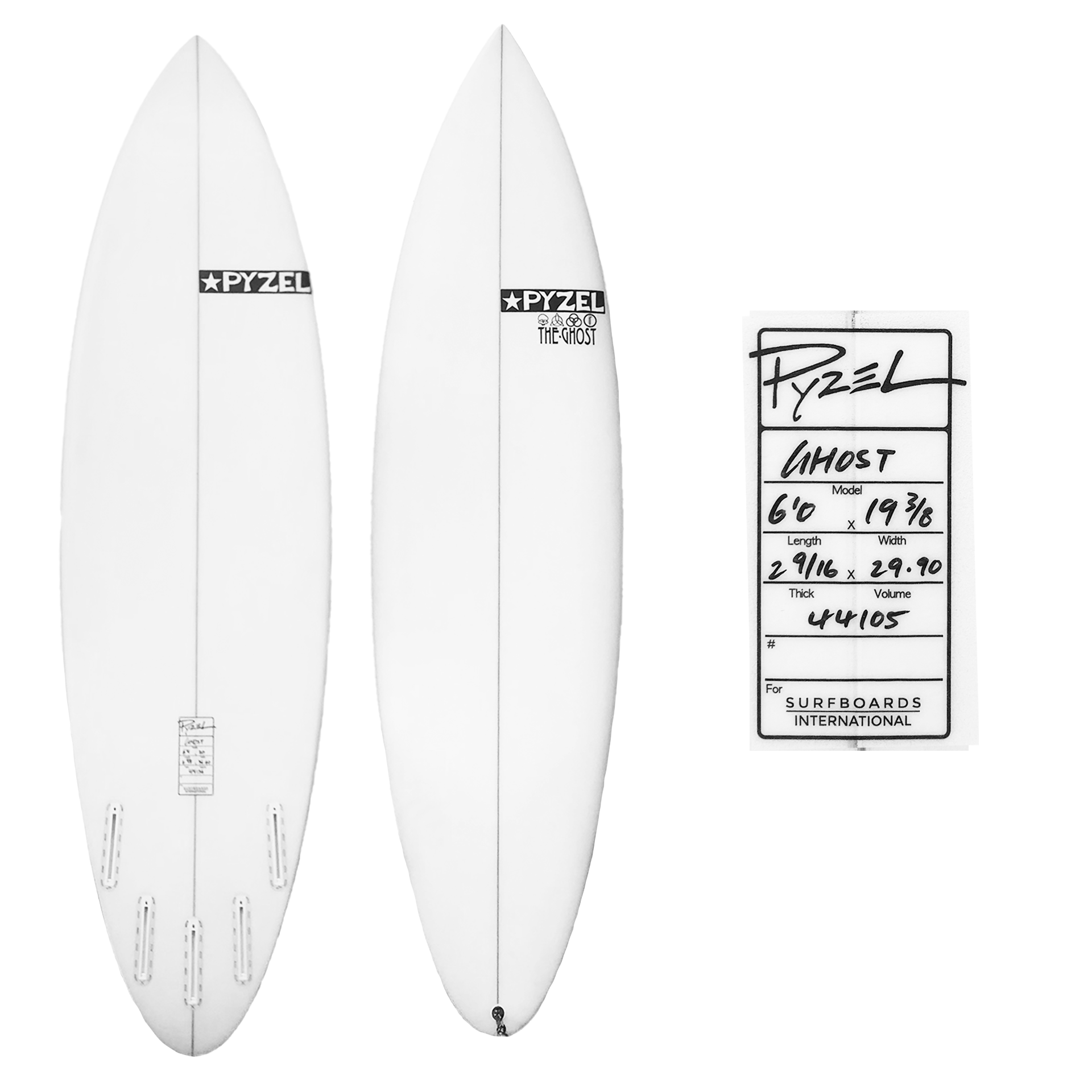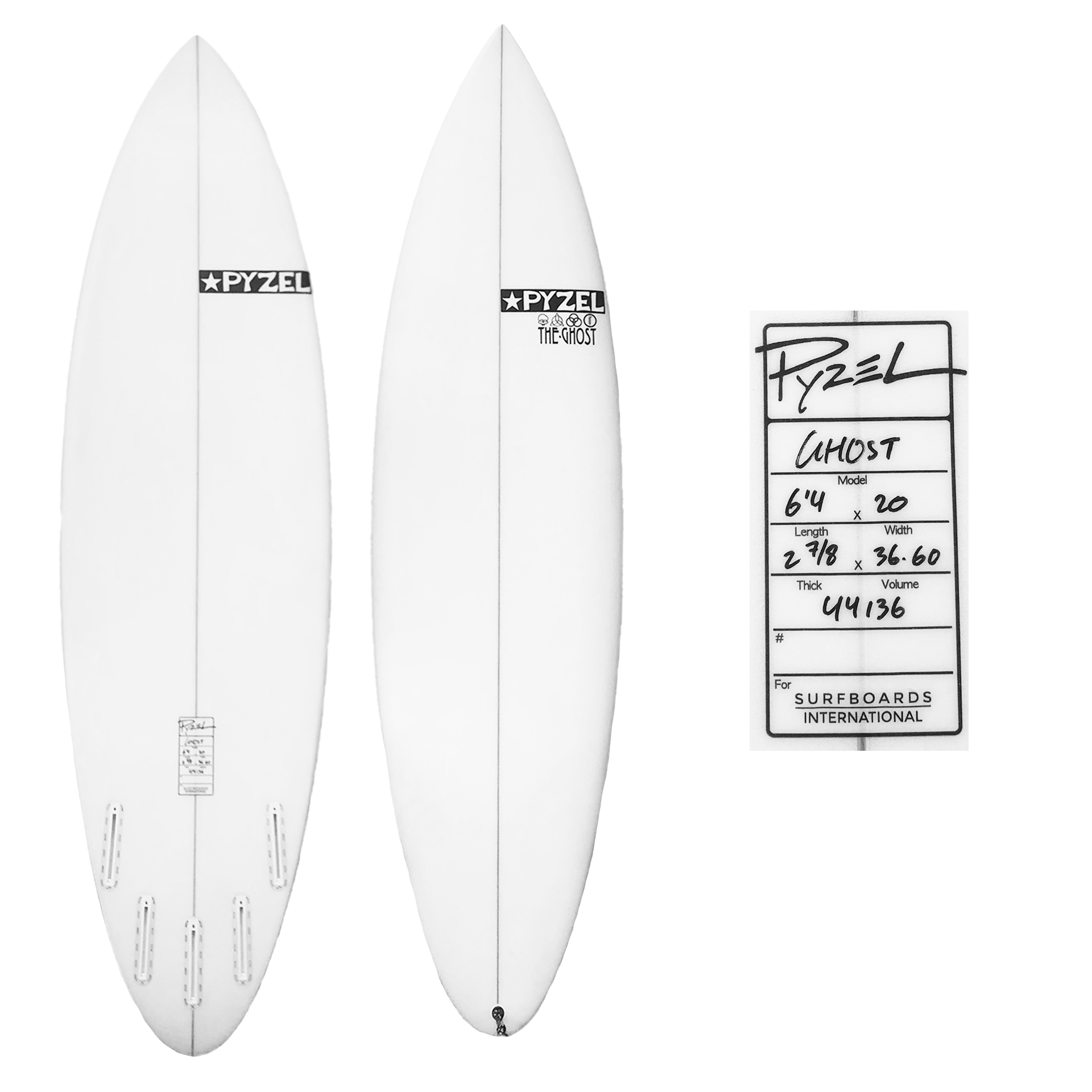 Depending on what you want to ride it in we recommend you order your Ghosts anywhere from your height to 8" over, a 1/4" to 1/2" wider, and 1/8" to 3/8" thicker than your everyday shorty. Stock boards all have 5-fin set up.