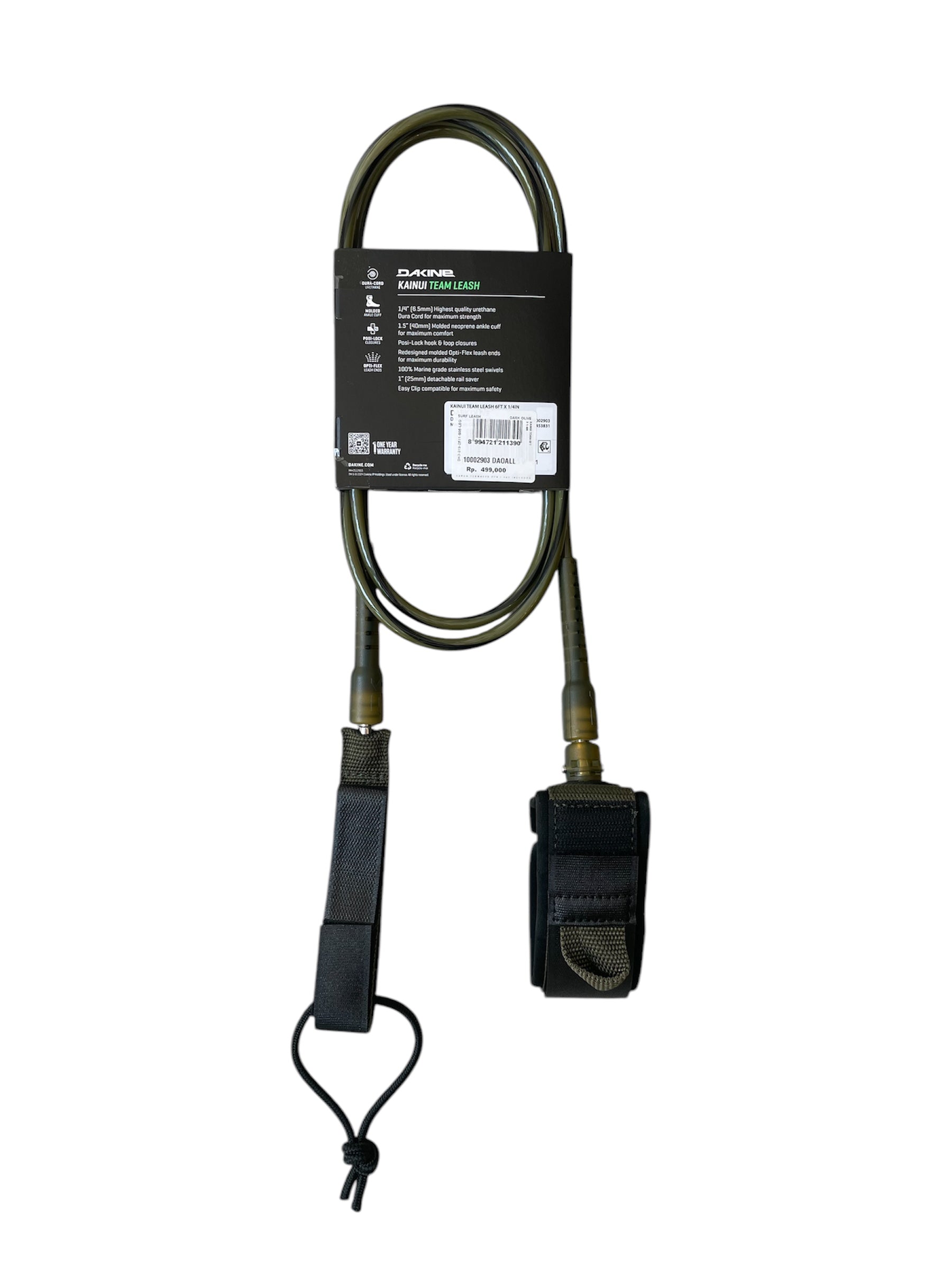 Serious swell calls for a serious leash. The Kainui surf leash offers trusted security in double to triple overhead peaks. It's built with stout 1/4-inch (6.5mm) urethane Dura-Cord to keep you connected to your board in the strongest conditions. Dakine built its reputation on building the strongest surf leash available, and the Kainui continues the tradition.